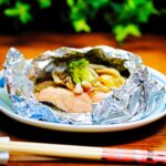 ⑥ 180℃に予熱したオーブンで20分焼く。とり出してオリーブ油(大さじ1)をかけ、黒コショウ(少々)をふる。